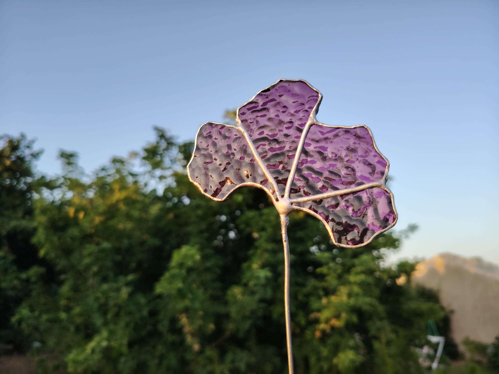 Corolle : 14*11cm. Verre violet translucide texturé. Fleur montée sur tige en cuivre étamée. Prix de vente : 60€ hors frais de port.