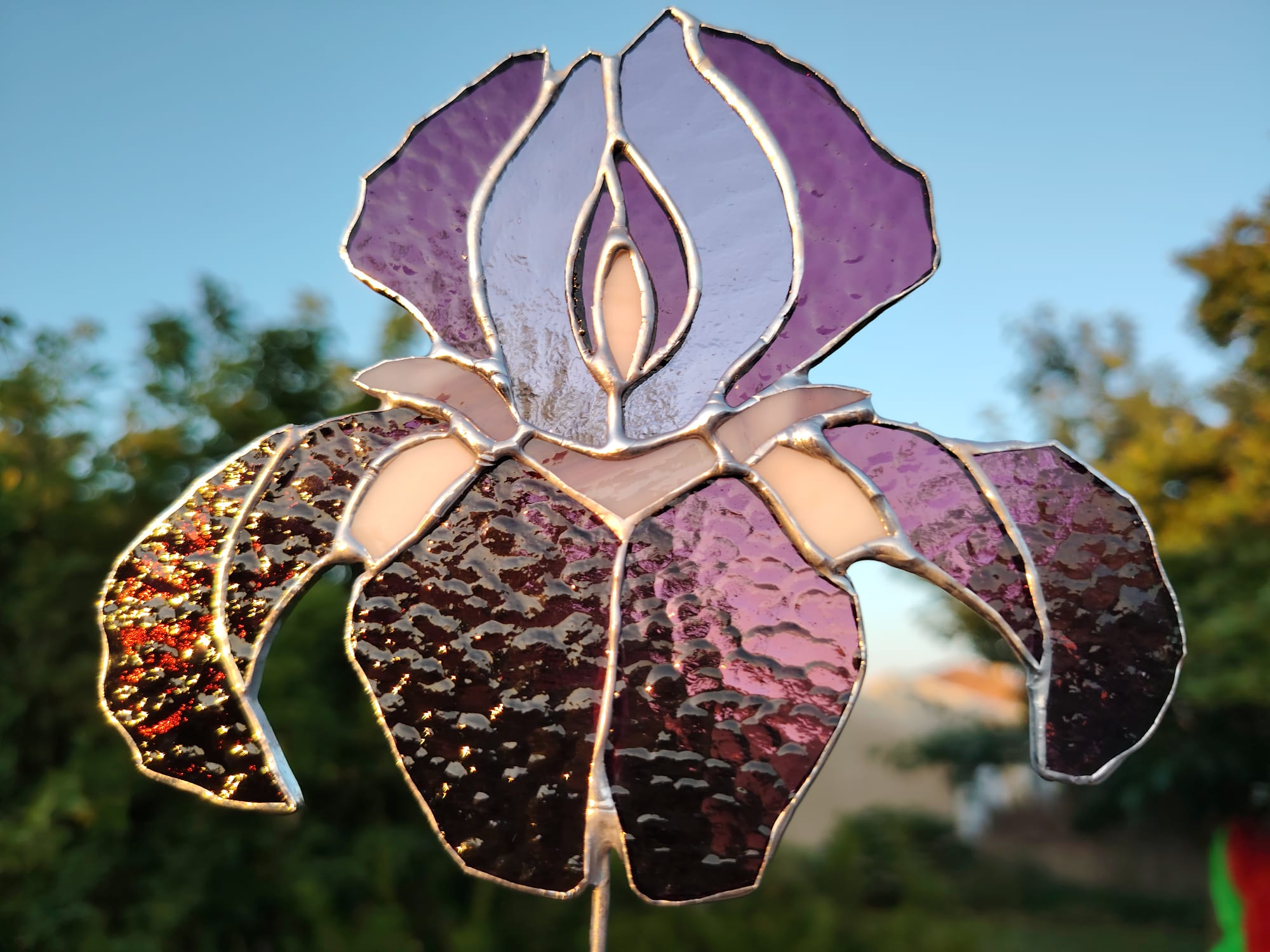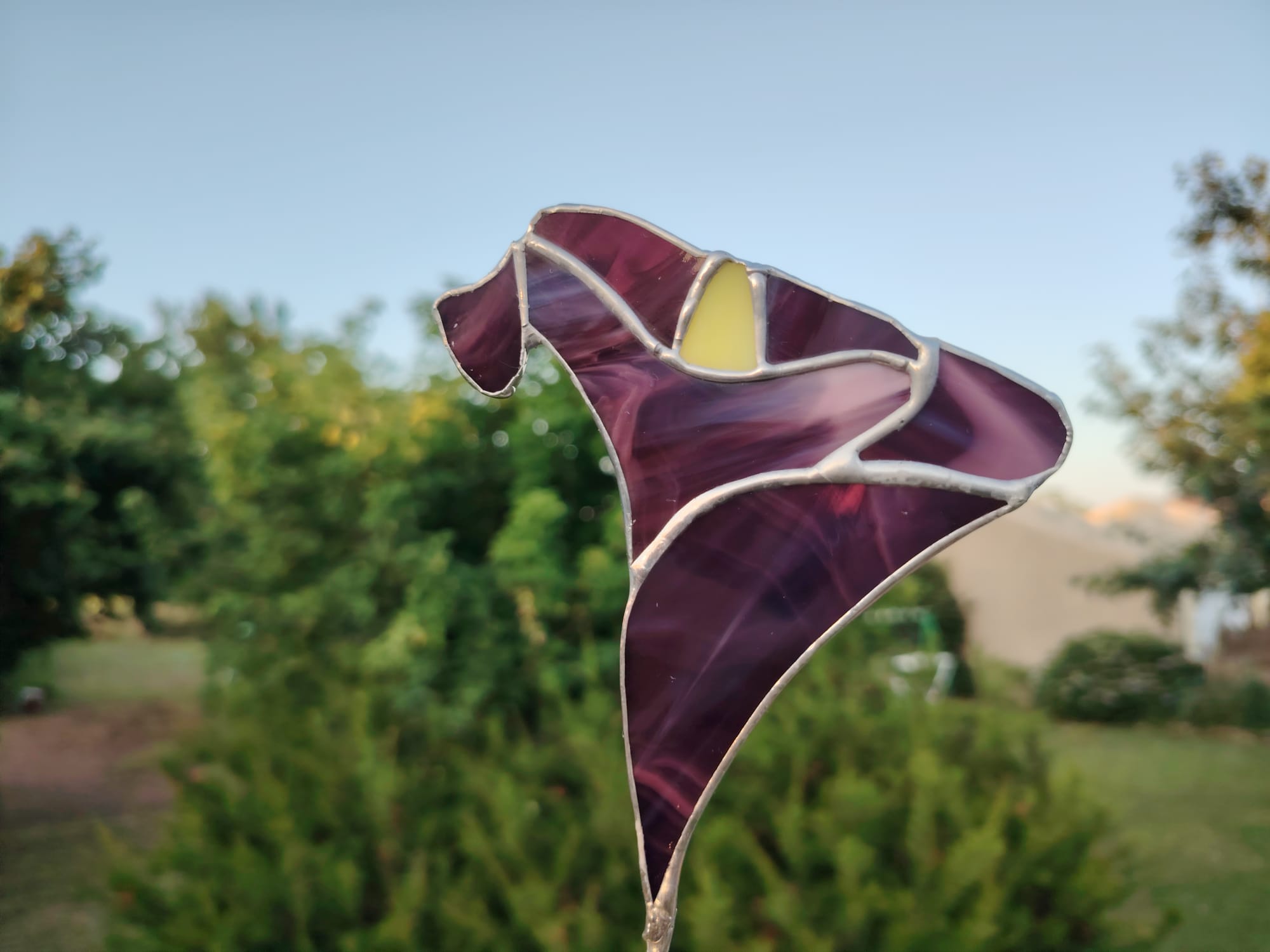Verre violet et blanc semi-translucide. Corolle : 9x10cm. Fleur montée sur tige en cuivre étamée. 20€ hors frais de port