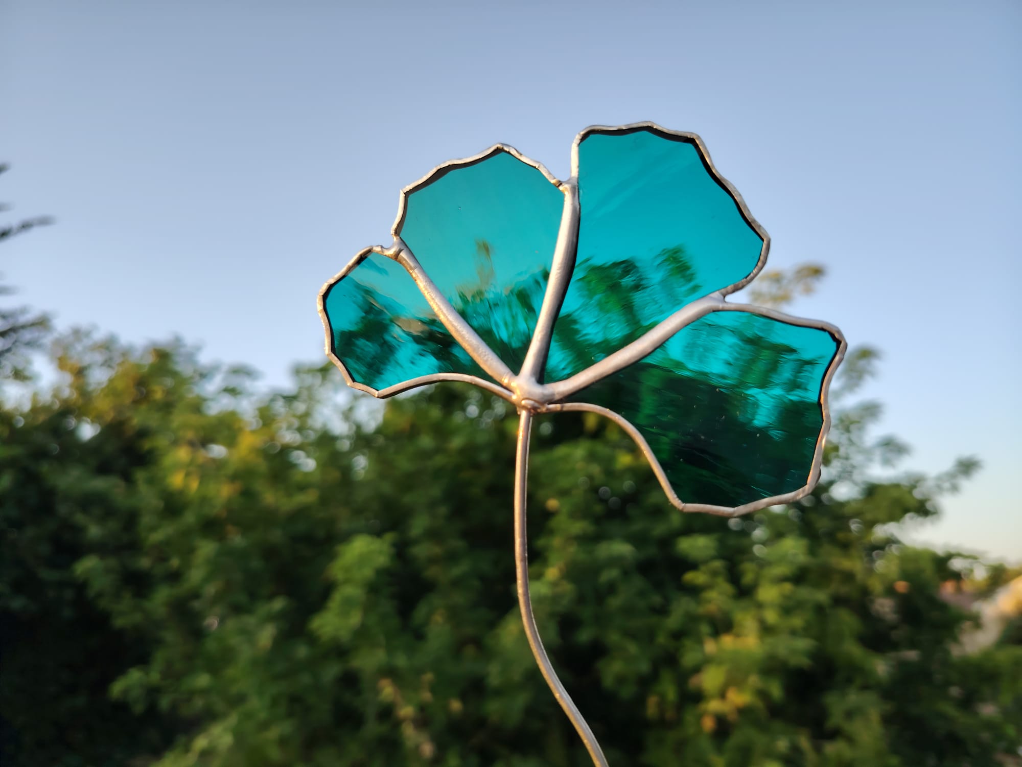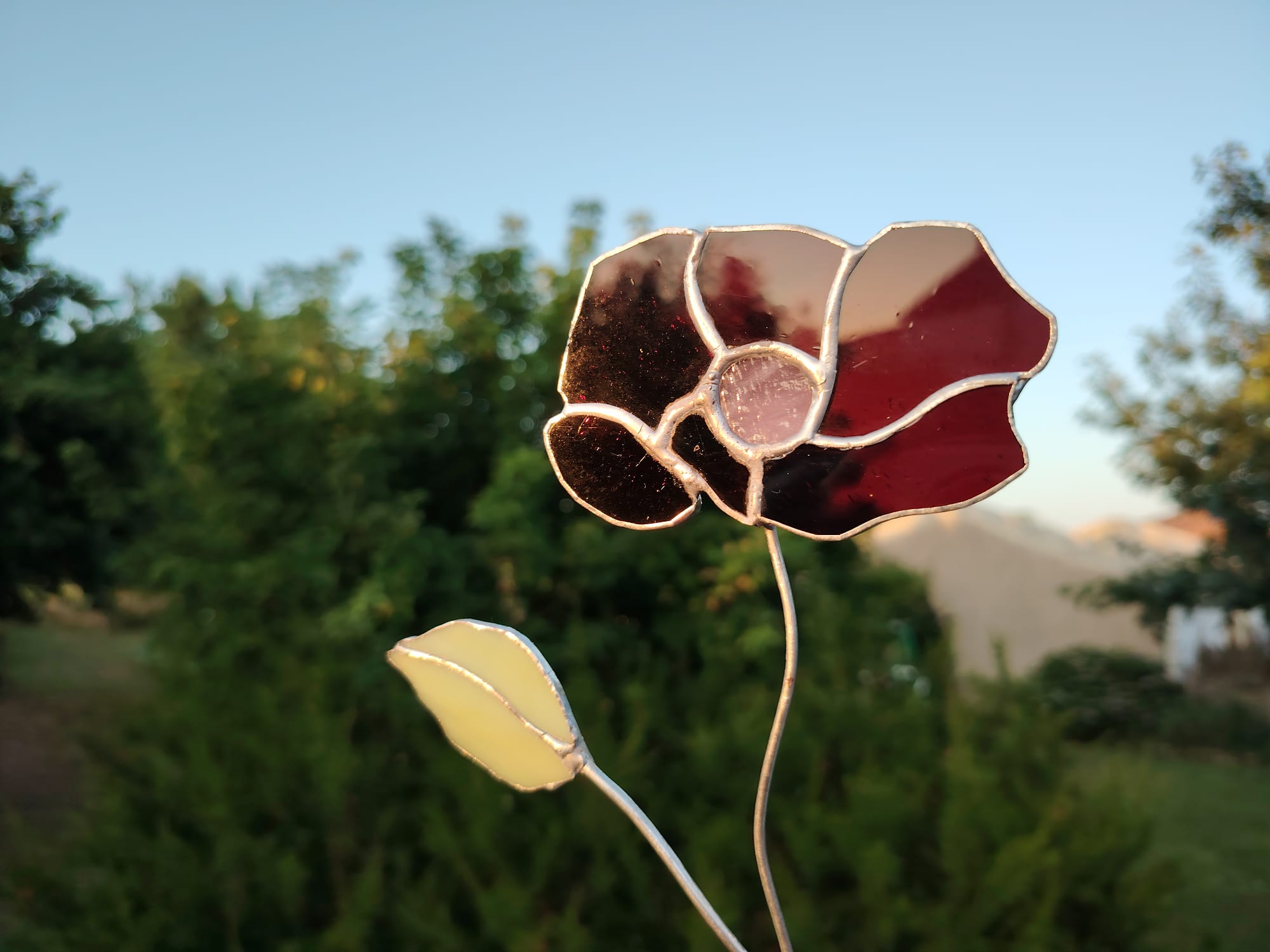 Pétales : verre blanc opaque, cœur jaune translucide. Fleur montée sur tige en cuivre étamée.10.5*10cm. Prix : 33€ hors frais de port.