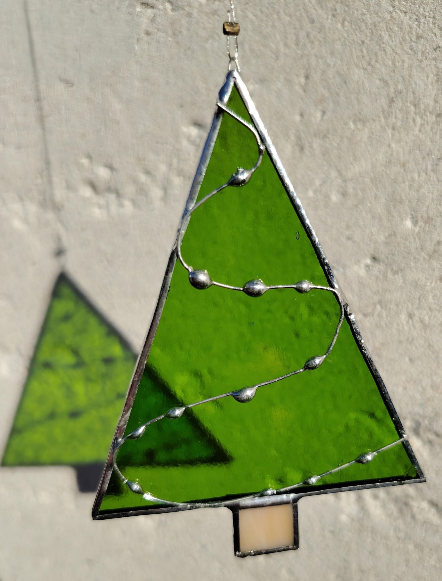 Vert clair opalescent, vert moyen translucide, vert sapin irisé - fil de suspension acier inox tressé fourni. 90 € hors frais de port