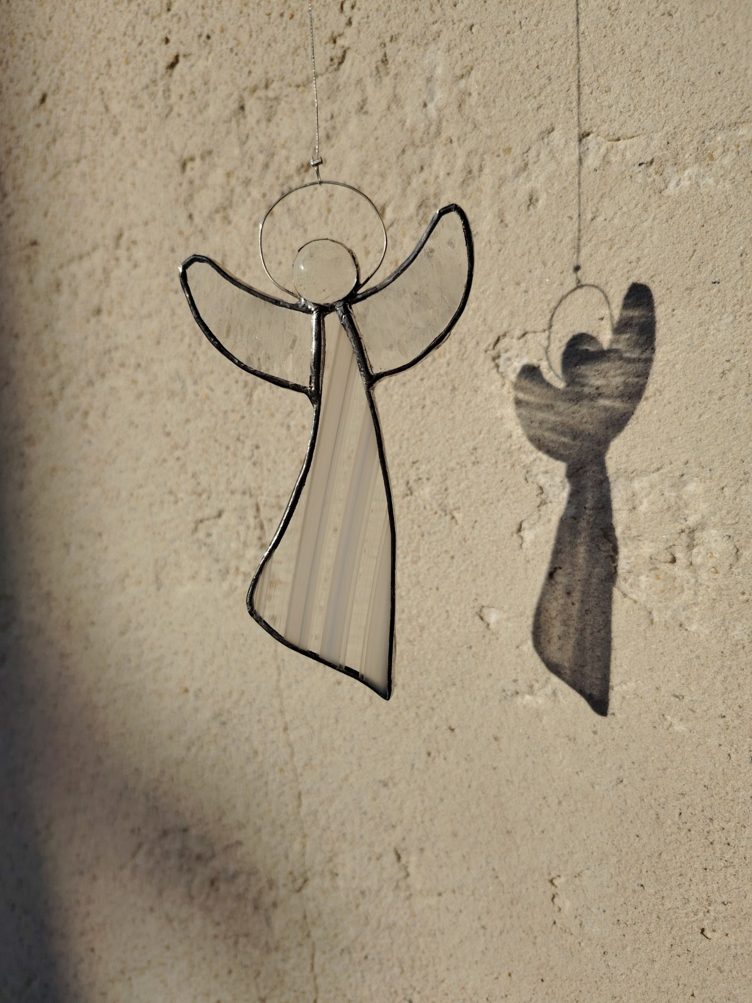 Verre blanc baroque, ailes translucides texturées. Fil de suspension en acier inox tressé fourni. 13 € hors frais de port